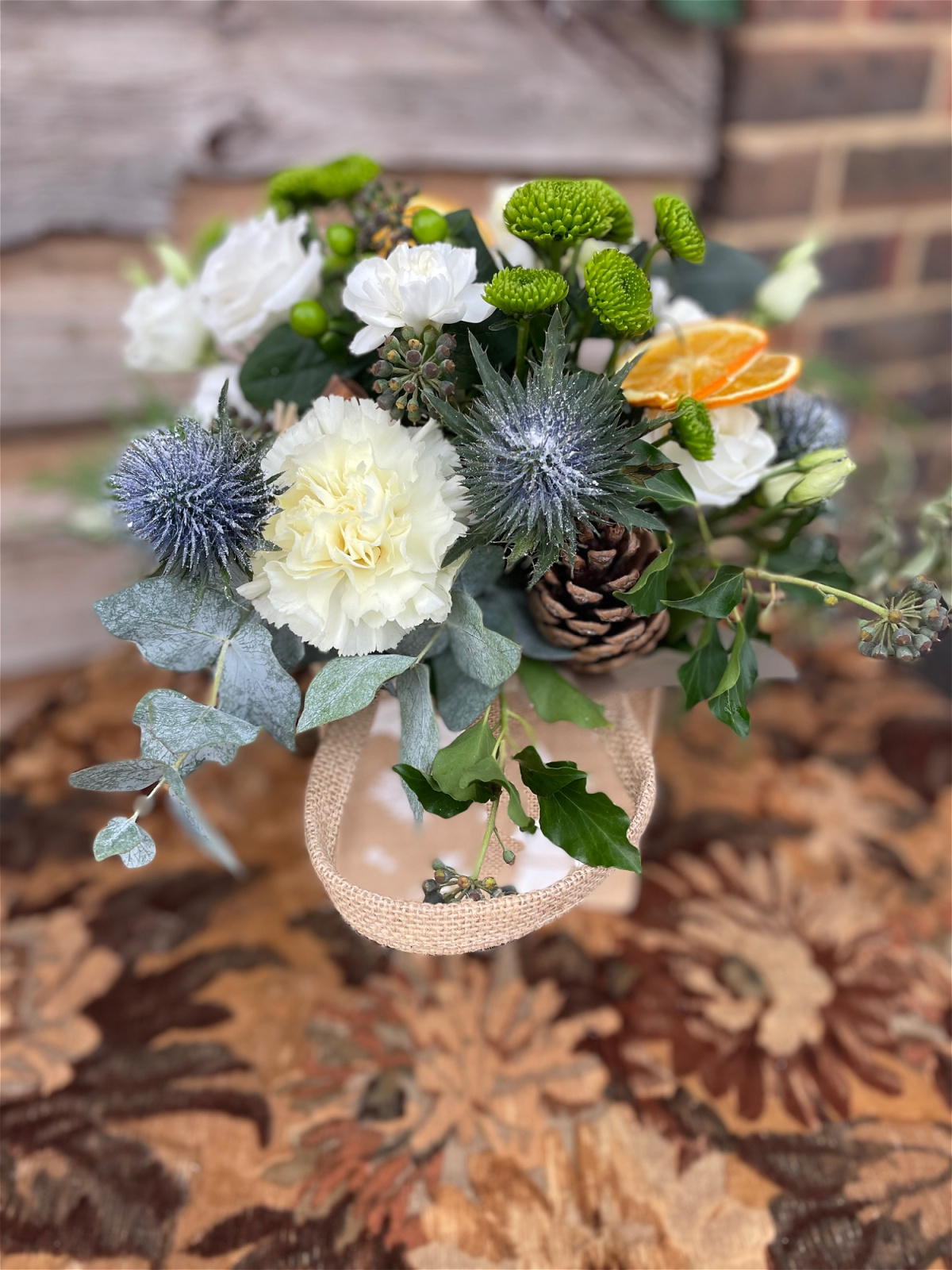 Available in two colours - red or white. Designed using seasonal flowers such as long lasting carnations, lime green chrysanthemums and foliage such as silver Eucalyptus, pine, cinnamon and sweet scented orange slices, which are all arranged in a cute bag, ready to go on display.